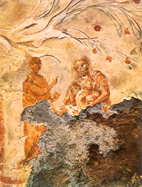 Priscilas katakombu freskas fragments Romā, 3. gs. sākums. Senākais Svētās Jaunavas Marijas attēls.