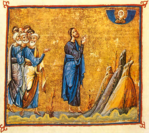 Kristus lūgšanā vēršas pie Tēva (sal. nr. 2599). Viņš lūdzas viens tuksnešainā vietā. Kristus mācekļi godbijīgi iztālēm vēro Viņu. Sv. Pēteris, apustuļu galva, griežas pie pārējiem un norāda tiem uz Kristu, kurš ir kristīgās lūgšanas Skolotājs un Ceļš (sal. nr. 2607): "Kungs, iemāci mūs lūgties." ( Lk 11, 1)
